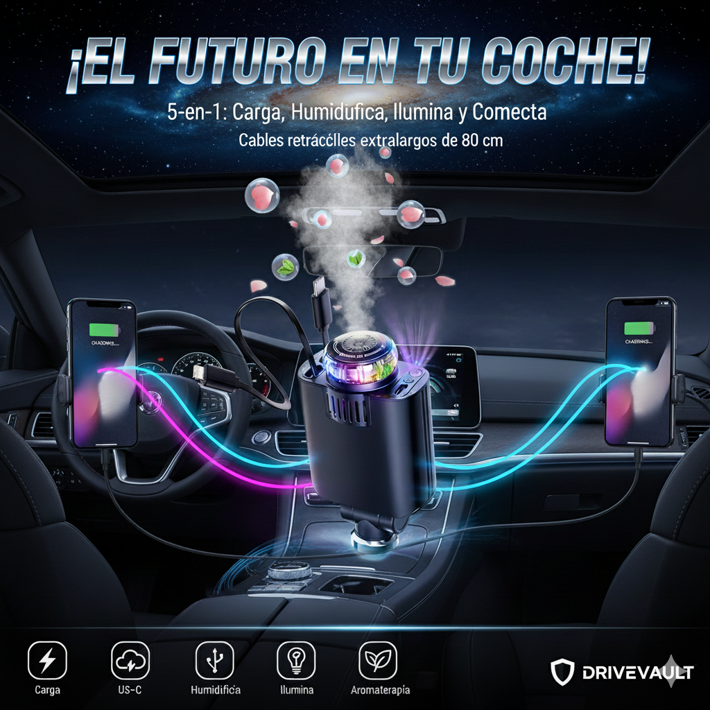 Convierte cada viaje en una experiencia única. Este cargador no solo mantiene todos tus dispositivos con carga rápida y segura gracias a sus 2 cables retráctiles (Tipo-C e iOS) y puertos extra (USB-C y USB-A), sino que también incorpora aromaterapia que libera una fragancia natural en tu coche 🌿.