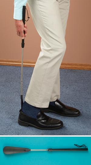 Extender el mango telescópico hasta la longitud deseada. Colocar el clip sobre el talón del zapato para sujetarlo. Deslizar el pie dentro del calzado sin necesidad de inclinarse. Para quitar el zapato, usar el extremo curvo del calzador como palanca. Guardar plegado para ahorrar espacio.