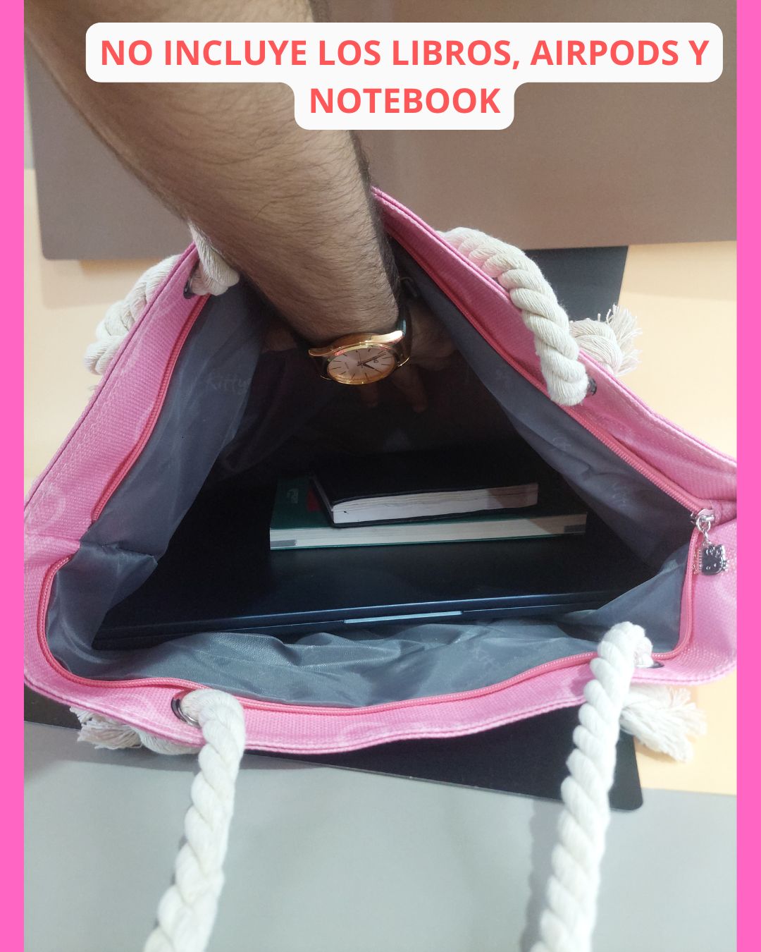 Airpods, Notebook y Libros NO INCLUIDOS son para ilustrar el tamaño del bolso