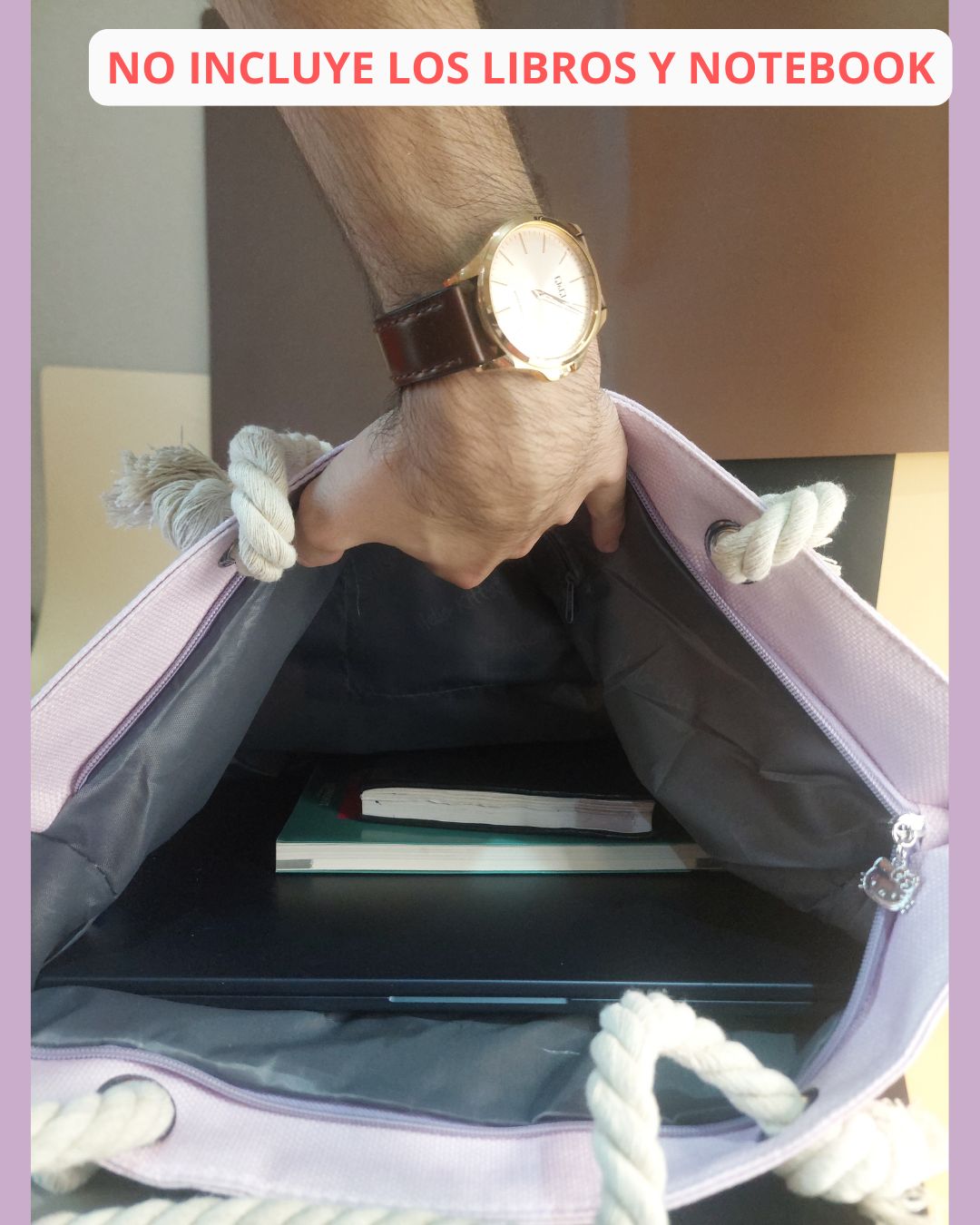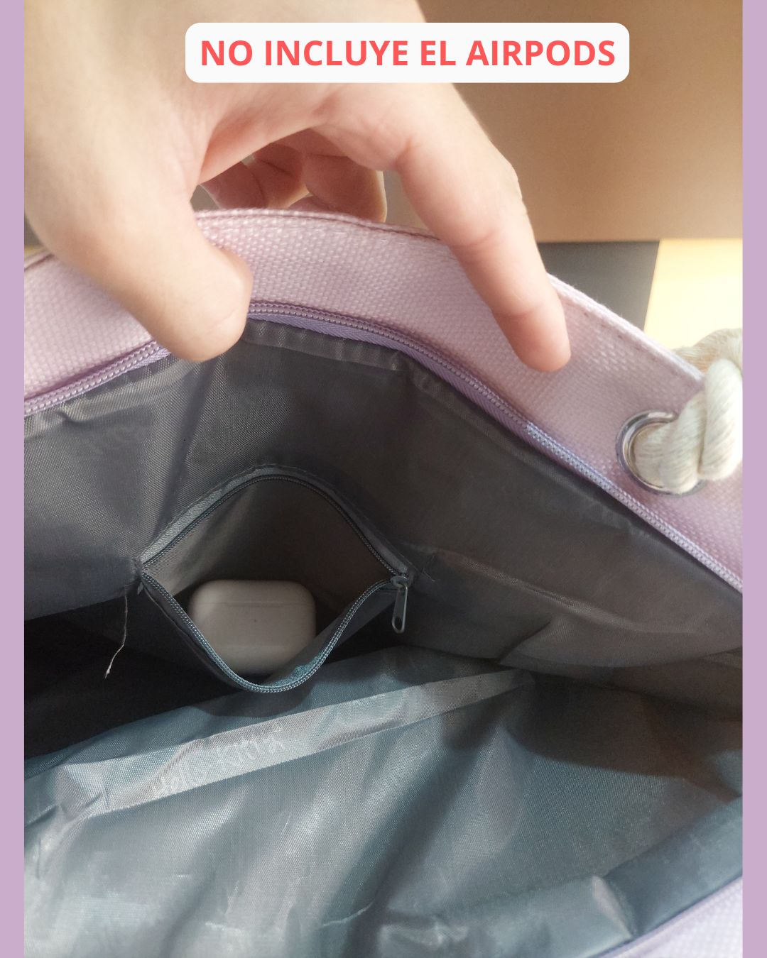 Airpods, Notebook y Libros NO INCLUIDOS son para ilustrar el tamaño del bolso