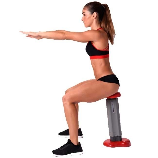 Ubicar la máquina sobre una superficie plana. Ajustar la altura del soporte según la estatura del usuario. Colocar los pies en la base y sujetarse del manillar. Realizar sentadillas guiadas manteniendo la espalda recta y las rodillas alineadas. Repetir según rutina. Al finalizar, limpiar con paño seco y guardar en posición plegada si se desea.