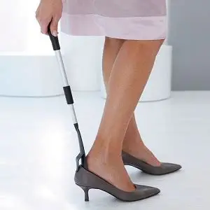 Extender el mango telescópico hasta la longitud deseada. Colocar el clip sobre el talón del zapato para sujetarlo. Deslizar el pie dentro del calzado sin necesidad de inclinarse. Para quitar el zapato, usar el extremo curvo del calzador como palanca. Guardar plegado para ahorrar espacio.