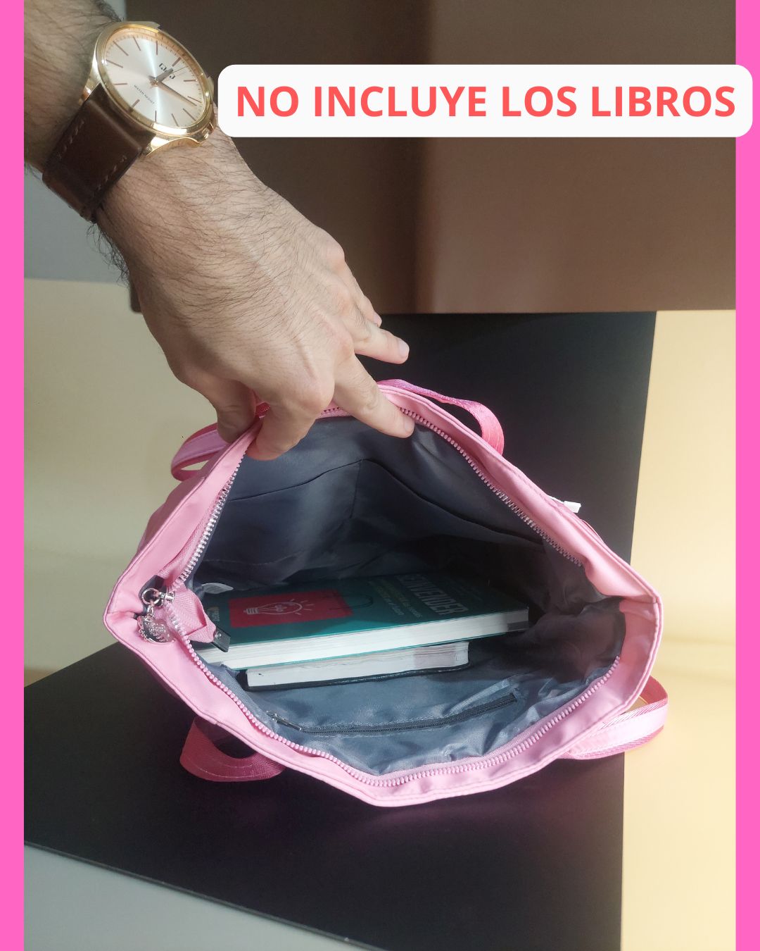 Airpods, Notebook y Libros NO INCLUIDOS son para ilustrar el tamaño del bolso