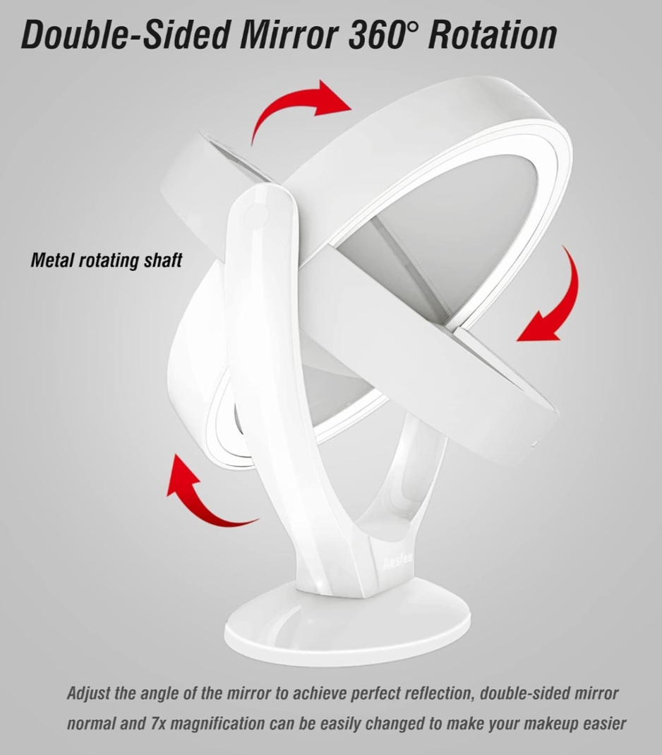 Diseño de doble cara: el espejo 1x se usa para el maquillaje regular, y el espejo con aumento de 7x le permite lograr fácilmente un maquillaje facial preciso. El diseño de rotación libre de 360 grados de doble cara hace que sea fácil encontrar el reflejo perfecto